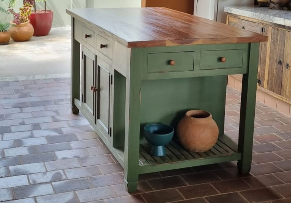 Na cozinha, a bancada/ ilha verde de madeira maciça se tornaram o sonho de consumo de muita gente. Com duas gavetas em cada cabeceira e duas prateleiras e em uma de suas laterais com 3 gavetas e três armários abaixo e do outro lado recuo para colocação de banquetas! Podemos fabricar em qualquer medida ou cor. Pausa para admirar tanta beleza...Maravilhosas, né? As peças são exclusivas, de madeira maciça com tampos da cor da madeira e sua estrutura na cor verde. O design? Aqui, o material é quem dita a disposição de todo o espaço. Os veios visíveis da madeira garantem um ar mais rústico ao cômodo de layout moderno. Já o tom natural predomina e abre espaço para uma paleta de cores sóbria e elegante. A diferença da cozinha americana, para uma cozinha com ilha, é que a primeira sempre está ligada a uma parede ou coluna, enquanto na segunda o móvel fica livre. São, porque nela você pode fazer a praça de trabalho, a montagem de pratos, o “mise en place”. Ora instalar fogão ou cooktop central, ou até mesmo levar as instalações hidráulicas para uma cuba. MEDIDAS : 2,00 C x 1,00 A x 1,00 L